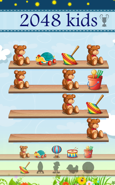 - Children - pictures of toys. Child during the game sees a picture if discovered and how many photos are still to be discovered (in the form of shadows). When a child discovers the last shadow of him now it remains only to discover a picture with the trophy (equivalent to 2048 in normal mode)