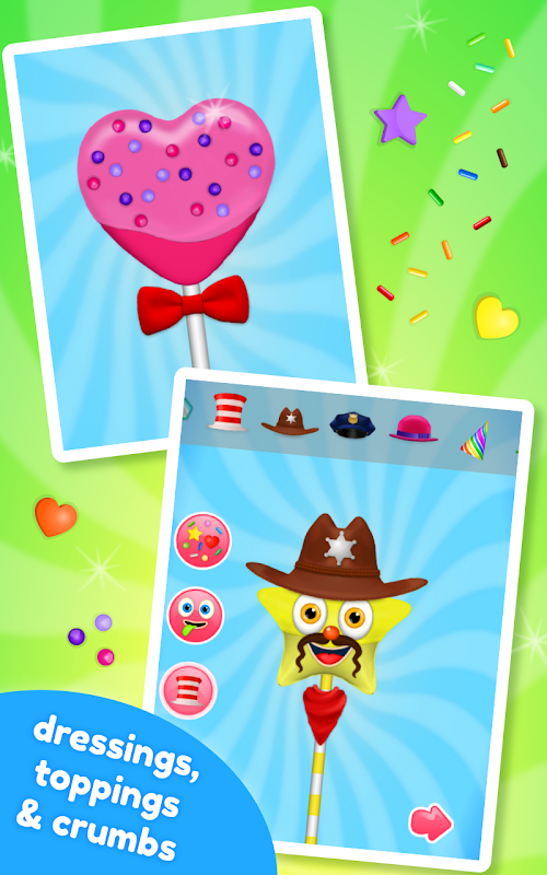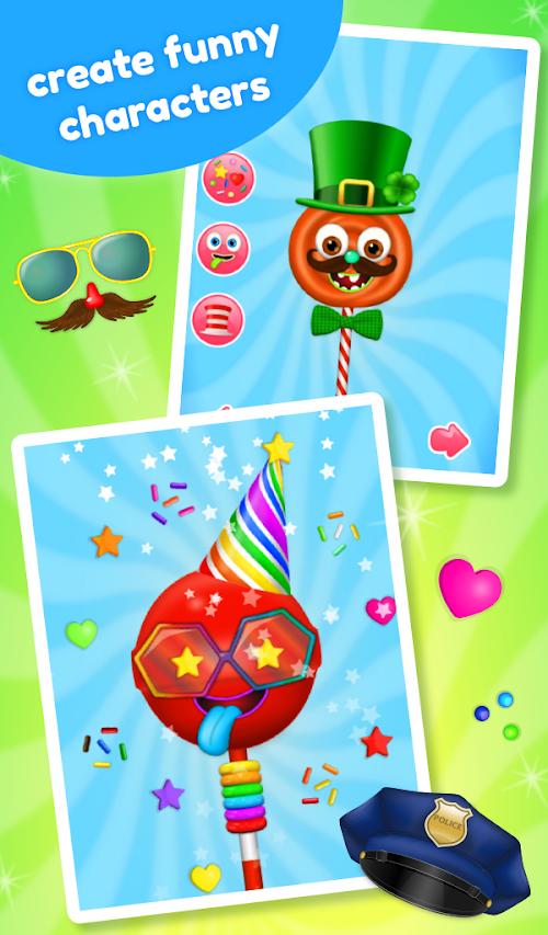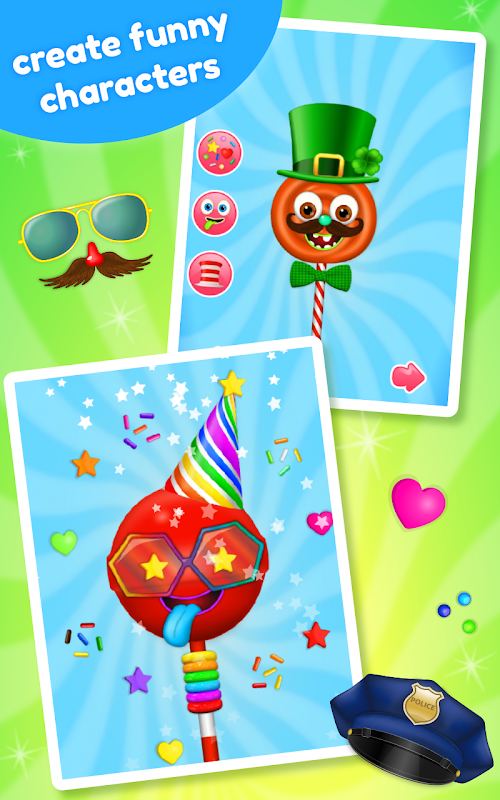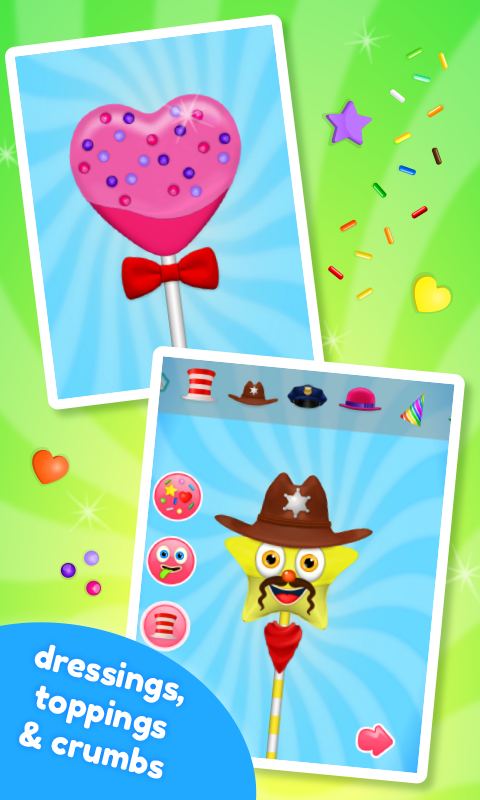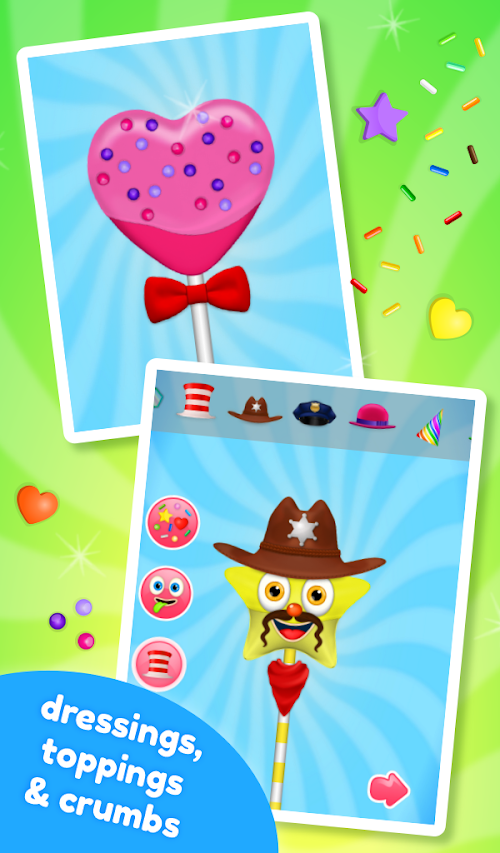 Add the final touch with dressings and toppings and colorful crumbs. If you like cute faces, decorate the lollipop with eyes, mouth, moustaches, hat, bow, tie, eyeglasses or many other accessories available.