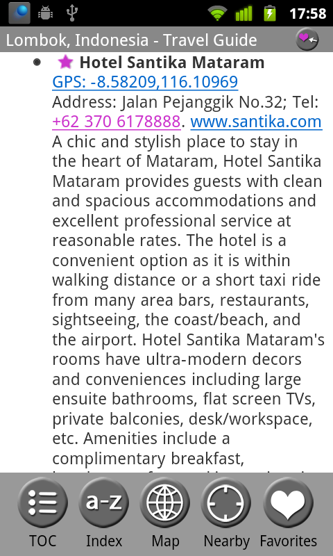 MobileReference Travel Guides provide detailed, practical information about attractions, landmarks, transportation, cultural venues, dining, lodging, history and much more. They are indexed alphabetically and by category, making it easier to access individual articles. Attractions can be viewed on an offline GPS map along with your current location so that you can easily find attractions near you as you explore the city.