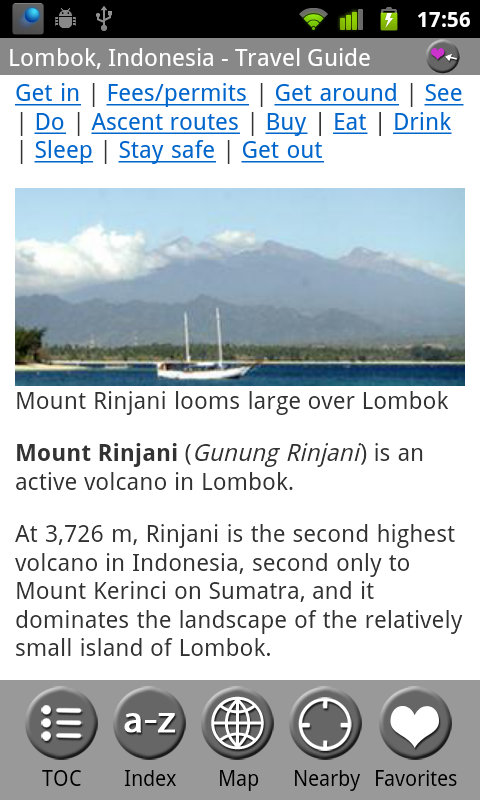6. Indonesia: Get in | Get around | Geography | Flora & Fauna | Regions | History | Demographics | Government & Politics | Economy | Culture | Cuisine | See & Do | Sleep | Buy | Contact