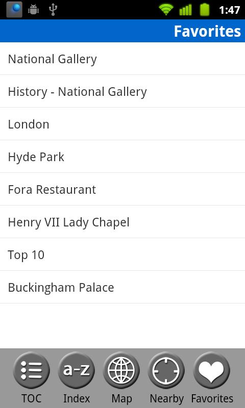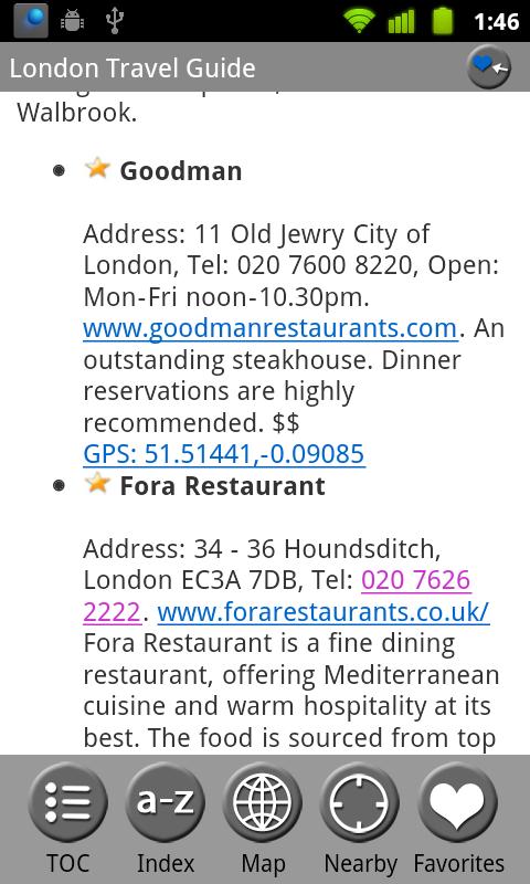 MobileReference Travel Guides provide detailed, practical information about attractions, landmarks, transportation, cultural venues, dining, lodging, history and much more. They are indexed alphabetically and by category, making it easier to access individual articles. Attractions can be viewed on an offline GPS map along with your current location so that you can easily find attractions near you as you explore the city.