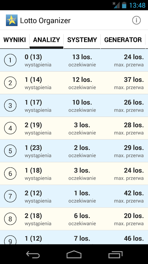 4. Poznasz MAKSYMALNĄ (w ciągu ostatniego roku) oraz BIEŻĄCĄ przerwę w występowaniu każdej liczby.