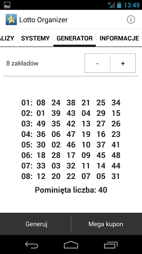 7. Wygenerujesz MEGA KUPON - zestaw ośmiu zakładów, w których żadna liczba się nie powtarza -- dzięki temu ewentualna WYGRANA praktycznie będzie zależała już tylko wyłącznie od ich rozłożenia (jedna liczba jest pomijana).
