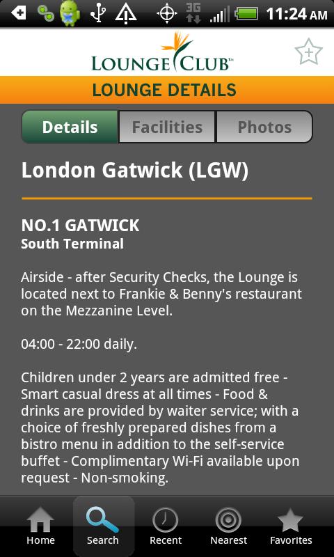 This free app is designed to assist LOUNGE CLUB members in finding an airport lounge anytime, anywhere by searching our database of all the lounges within the program. It allows users to search for a lounge by typing city or airport name as well as by scrolling through lists. You can save lounges as favorites, see recent searches and activate GPS to quickly find your nearest lounge. You can update the data at any time and then use offline.
