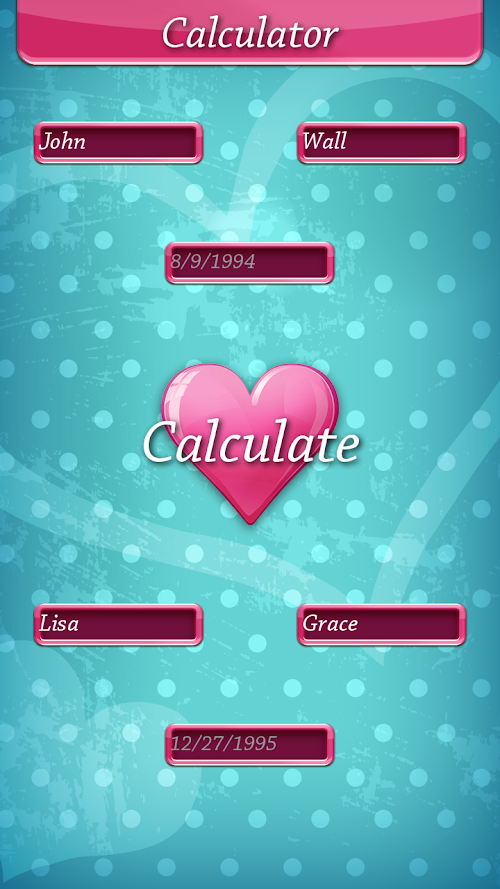 Therefore, what are you waiting for? Download ♥ Love Calculator for Couples ♥ and immediately find out the results of your love testing. If you've recently been hit by a Cupid's arrow, then now is the right time to do it. If you've been struggling with a love crisis, then now is the time to have a new crush and use this free love game for couples to calculate your love affinity! If you've been in a happy relationship for a long time, use this fun app to send magical love sayings to your sweetheart in order to strengthen your love.