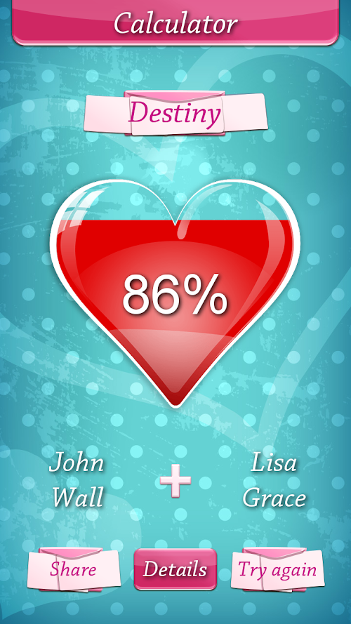 This romantic game offers you colorful design in the colors of love and intuitive tap controls which are suitable for all kinds of users. All generations will use this free love game with ease and they will surely adore it. It is suitable for kids, teenagers, and the adults, too. Males will love it, as well as the females. Therefore, it is the right time to download ♥ Love Calculator for Couples ♥ and finally get your share of fun!