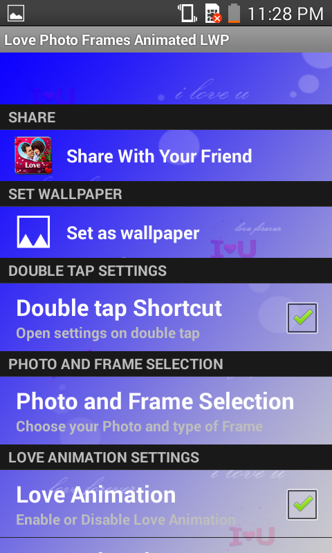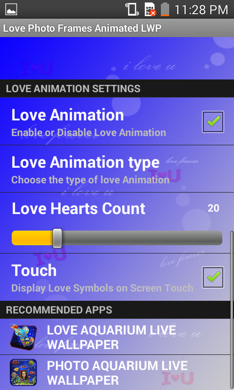 This amazing live wallpaper lets you add your photos in the Love Photo Frames, add lovely text, apply realistic love heart animation and Set as live wallpaper.