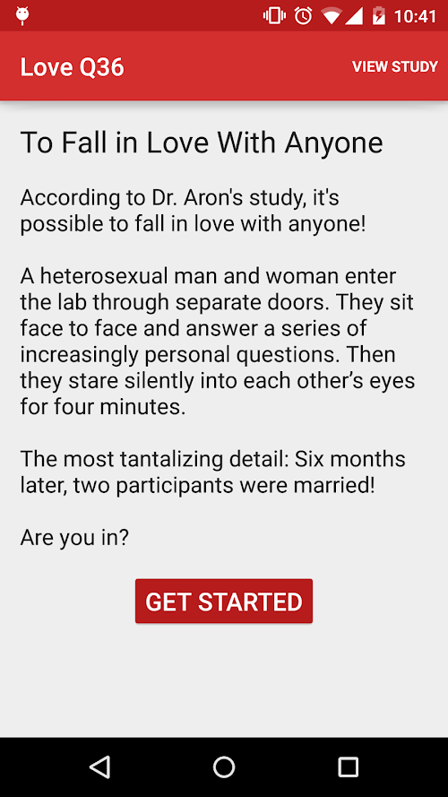 This app will give you an opportunity to take part in the Dr. Aron's experiment in which a heterosexual man and woman enter the lab through separate doors. They sit face to face and answer a series of increasingly personal questions. Then they stare silently into each other’s eyes for four minutes.