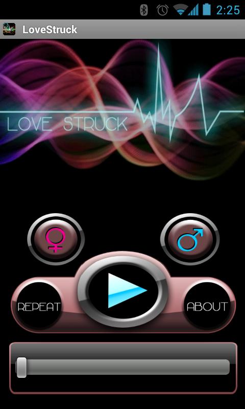 Love Struck is idiot proof. If you want to attract a girl – you push the girl button and hit play. If you want to attract a boy – you push the boy button and hit play. If you want the app to work in the background, non-stop – push repeat. That’s it! It doesn’t matter how loud or low your volume setting is. In a noisy room? No problem. Love Struck is designed to work subconsciously, like pheromones. Even in a bumpin’ bar, all the brains near you are zapped by Love Struck.