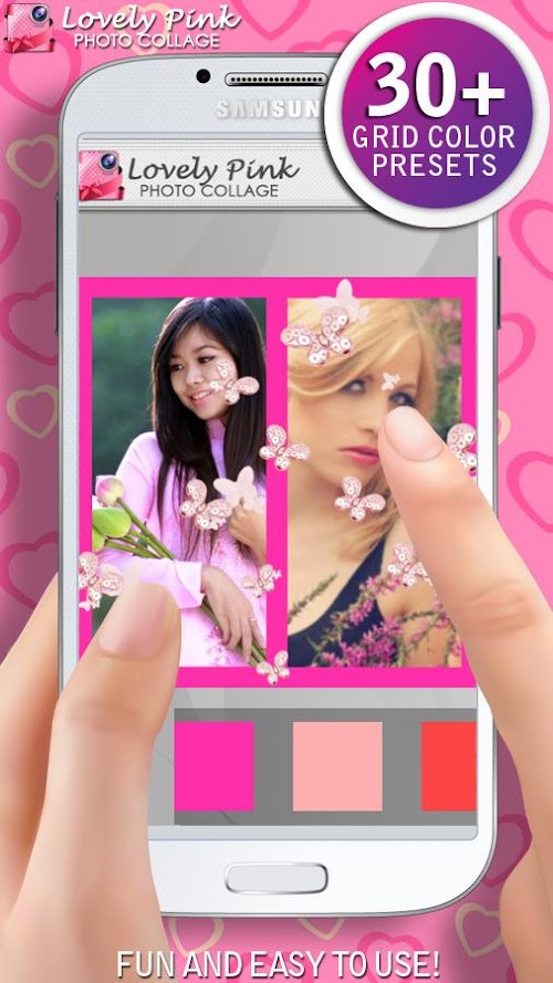 Now that you have lovely pink stickers and pink frames, add some photo effects such as black and white, sepia, pop art and many more! Your new edited pictures will look absolutely fabulous! Give it a try! If you want to create a beautiful collage of your friends and family, choose one of the templates and have all their photos in one place! Create lovely memories of your family and keep them with you every minute of your day! Cool, right? Pick a star shaped template, or a pink heart shaped template and add up to 7 photos of your loved ones. Add some sparkles and cute pink stickers and you are done! You will have a beautiful pink photo collage for your Samsung phone. If you want your girlfriend to see how much you love her, then you have to be caring and affectionate. Try the new ♀Lovely Pink Photo Collage♀ and show your love with wonderful pink collages. You can save your HQ photos on your phone or share them on Facebook, Twitter and Instagram. Everyone will love them!