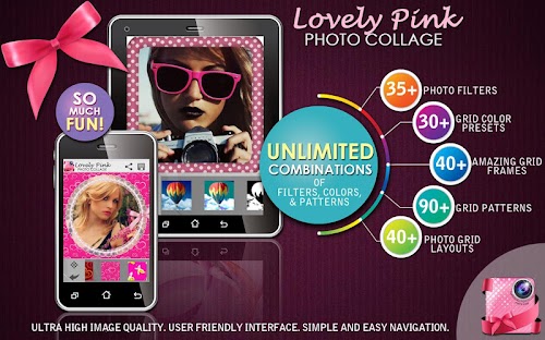 Check out this fabulous “photo collage” and be the first to make cute pink collages of your friends and family. If pink is your favorite color, then wait no more! Download it now and start making your own pink art gallery. All you need to do is take a few photos from your photo gallery and the photofunia can start right away! Choose lovely stickers-pink hearts, pink diamonds, pink glitters, pink dolphins… Whatever comes to your mind! There is a variety of beautiful pink decorations to choose from! When you are done with stickers, add a photo frame, too. You can pick a pink square frame or a pink round frame. Or maybe a frame with pink dots and flowers! It’s up to you! Have fun in the process of making wonderful collages because ♀Lovely Pink Photo Collage♀ offers more than 50 stickers, frames and photo effects. This awesome “photo editing“ free app is for everyone’s taste. If you are searching for romantic backgrounds, this “pink collage maker” is perfect for you! “Pic Collage app” allows you to create amazing collages using your own photos, stickers, text and frames. You will have an amazing “pics art” on your phone!