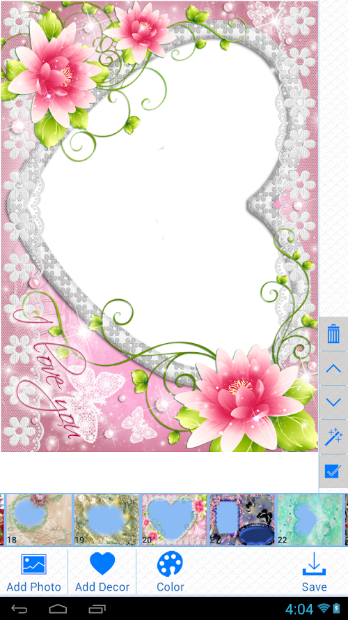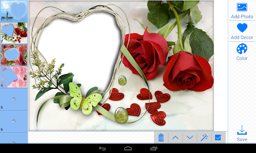 Apply beautiful heart photo frames for your love pictures. You can either choose an existing picture or take new picture for applying. The app has a collection of more than 100 beautiful frames for you to choose.