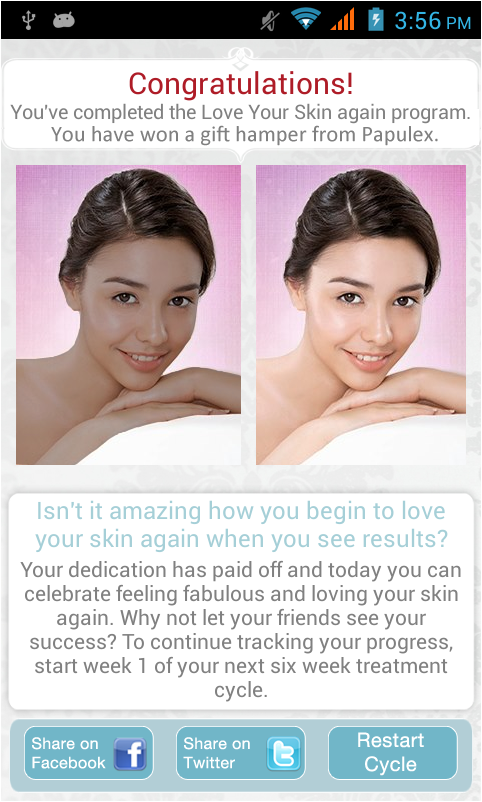 This Smartphone App is designed to work alongside the PapulexTM skin care range. Once, you’ve chosen the PapulexTM products that are right for you, whether they are from your doctor, pharmacist or via our sample packs, the app will help you get started. By recording your daily results, it helps to ensure you get the best from your products by incorporating them into your skin care routine. It allows you to upload photos, note your progress in your Skin Success dairy and share your results on Facebook or Twitter. Once, you’ve completed the recommended six weeks beauty regimen, you can choose to continue recording your progress, taking you onwards to even greater skin success.
