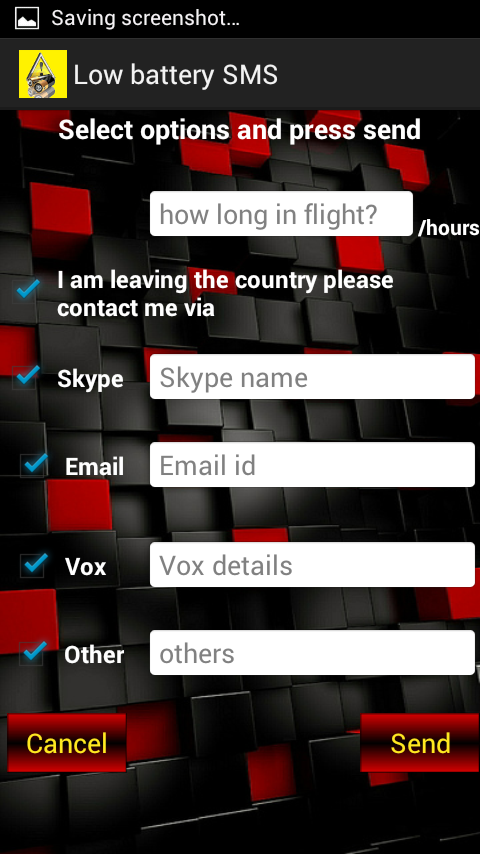 If you press the flight notification button then you will see a new screen in which you will set all information like total hours for flight, contact information, then press send button. This app sends your flight information in sms to all saved contacts in your app.