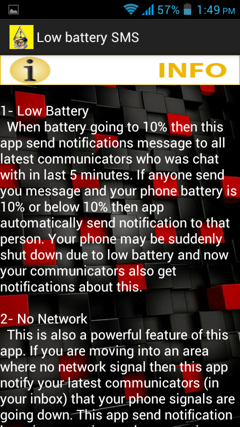 When your battery is going to 10% then this app sends a notification message to all the latest communicators who you chatted with within the last 5 minutes. If anyone sends you a message and your phone battery is 10% or below 10%, then this app automatically sends a notification to those persons.Your phone may be suddenly shut down due to a low battery and now your communicators will also get notifications about this.