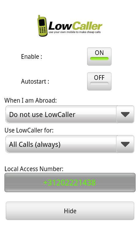 How does LowCaller achieve this? Well, LowCaller allows your phone to access the LowCaller system through a local access number (national number). If you have a contract with your mobile operator, calls to the LowCaller access number will be included within your regular monthly calling plan. If you are a pay-as-you go customer, your mobile operator will only charge you the cost of a local call.