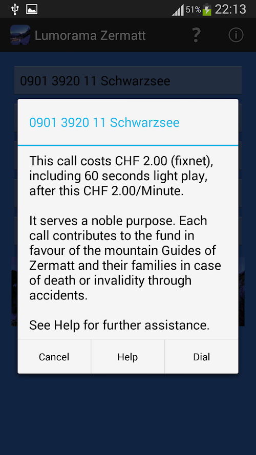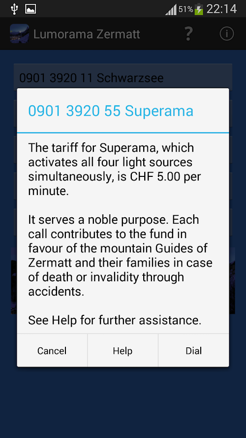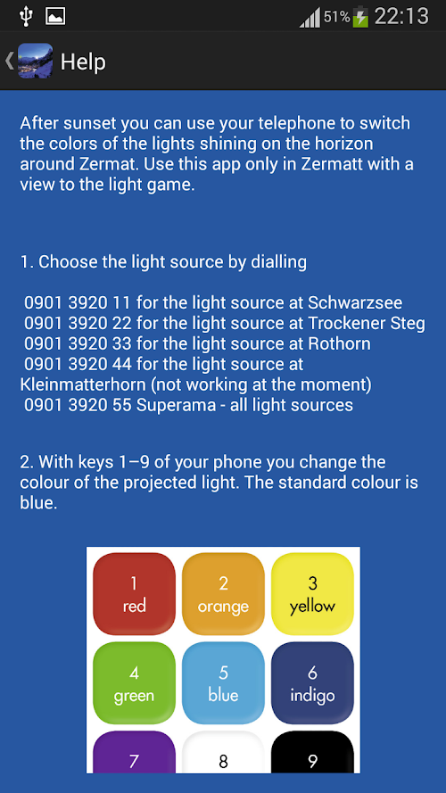 After sunset you can use your telephone to switch the colors of the lights shining on the horizon around Zermatt. Have good fun with this pastime that serves a noble cause.