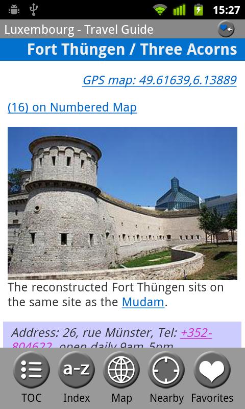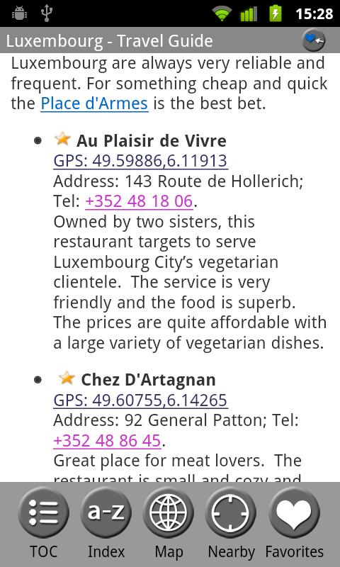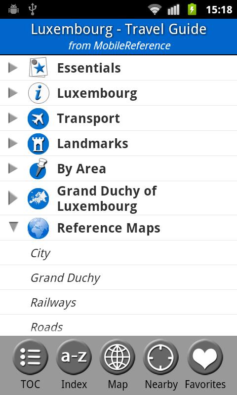 MobileReference Travel Guides provide detailed, practical information about attractions, landmarks, transportation, cultural venues, dining, lodging, history and much more. They are indexed alphabetically and by category, making it easier to access individual articles. Attractions can be viewed on an offline GPS map along with your current location so that you can easily find attractions near you as you explore the city.