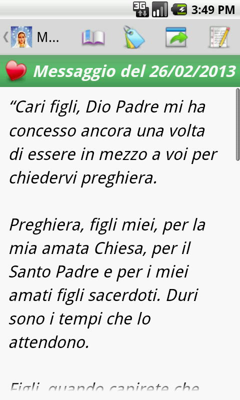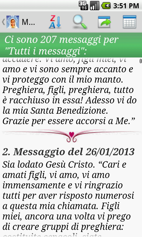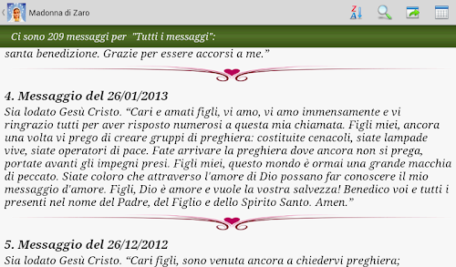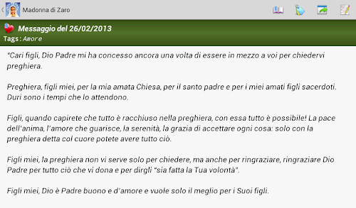 Conditions exist in the messages of Our Lady of Zaro. And 'possible to search within messages and save them by applying the tags. Research and tags you can export and send them via email or social networks. The messages are updated automatically. It 'an area dedicated to prayer with the main prayers of our tradition for newbies and not only ... there is the holy rosary, rosary for peace and the prayers of the Celestial Mama Zaro.