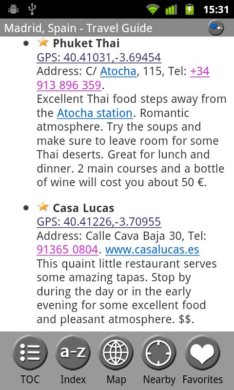 MobileReference Travel Guides provide detailed, practical information about attractions, landmarks, transportation, cultural venues, dining, lodging, history and much more. They are indexed alphabetically and by category, making it easier to access individual articles. Attractions can be viewed on an offline GPS map along with your current location so that you can easily find attractions near you as you explore the city.
