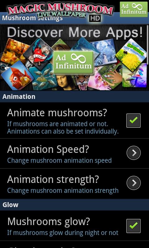 * Alot of settings: choose FPS, animationspeed, visibility of mushrooms, mushrooms glow intensity and animationspeed