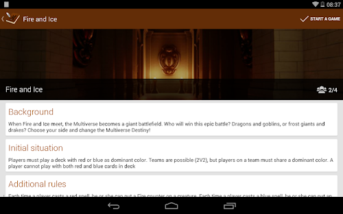 Magic Storytelling allows you to browse various kind of scenarios with variant rules for Magic. You can play with rules for a complex story, with a huge background and a lot of rules, or a simple variant on rules, which allow quick but funny games!
