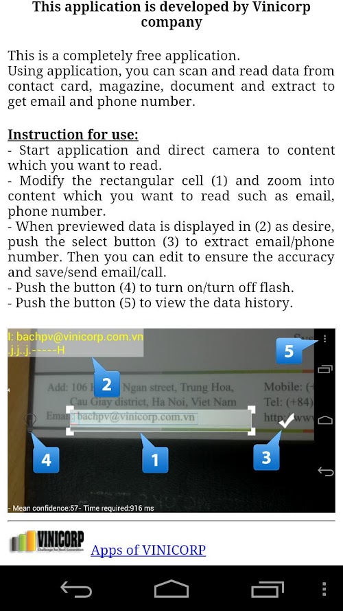 This application is completely free and developed by VINICORP Company based on Handwriting recognition OpenSource Tesseract-OCR.