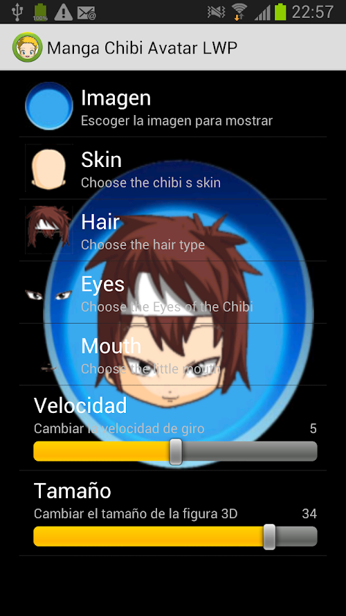 After selecting “ Manga Chibi Avatar LWP”, you can configure the APP on “settings”. You can change the turning speed and adjust the size.