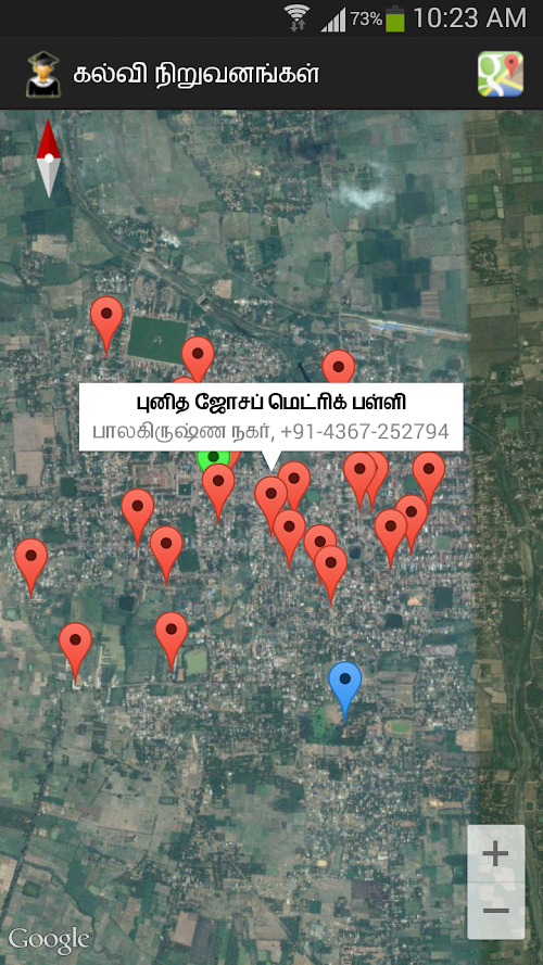 Information are location specific and important locations are marked on map. Locations and Markers can be viewed both in Normal and Satellite Maps. Markers provide the name and contact details (if any) of the location.