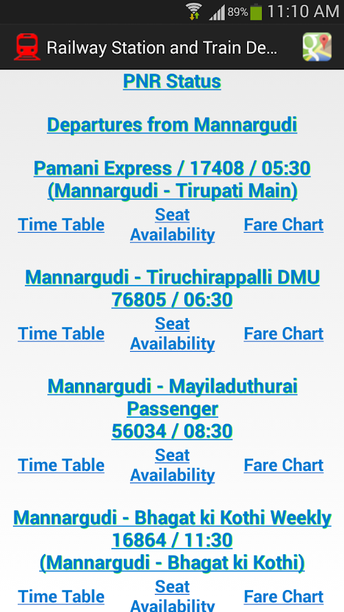 Railway Information contains details about all the 12 trains arriving and departing from Mannargudi. Every train information contains Time Table, Seat Availability and Fare Chart. Options are available to check PNR Status.
