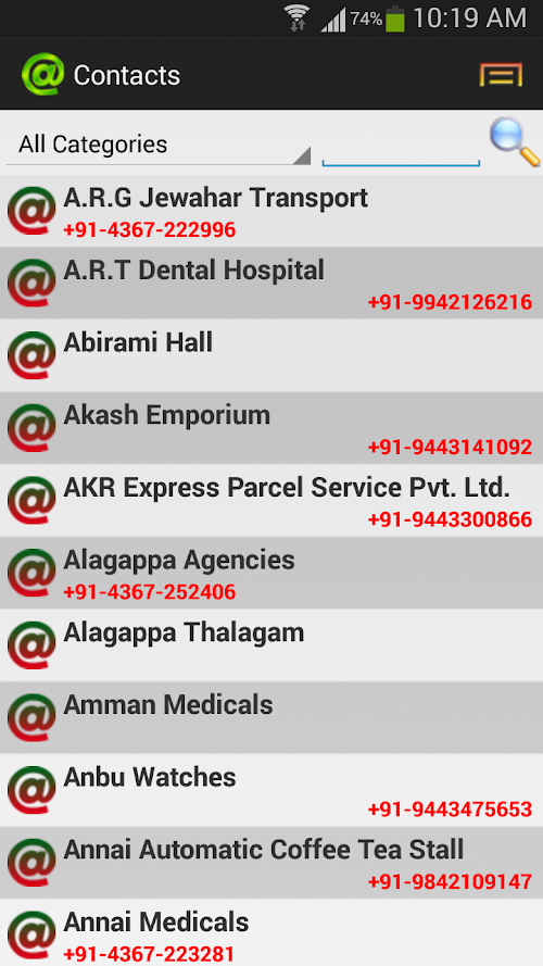 Nearly 400 business and contact information are stored by default. Options are available to add, edit, delete, call, send sms and mail to contacts.