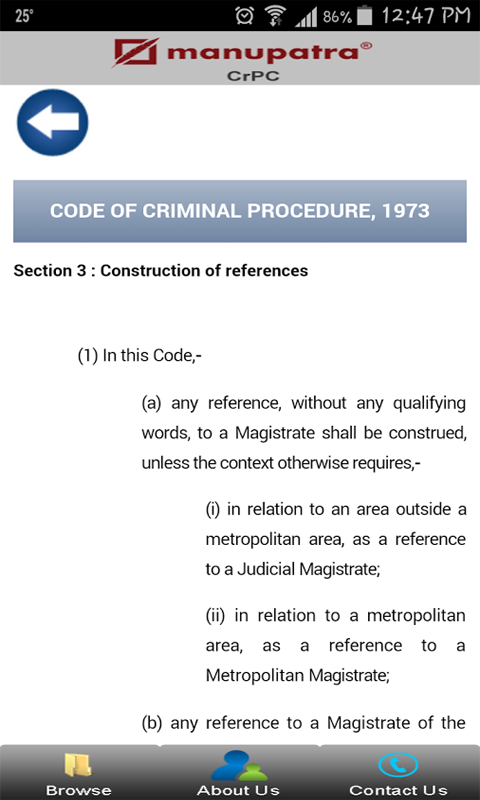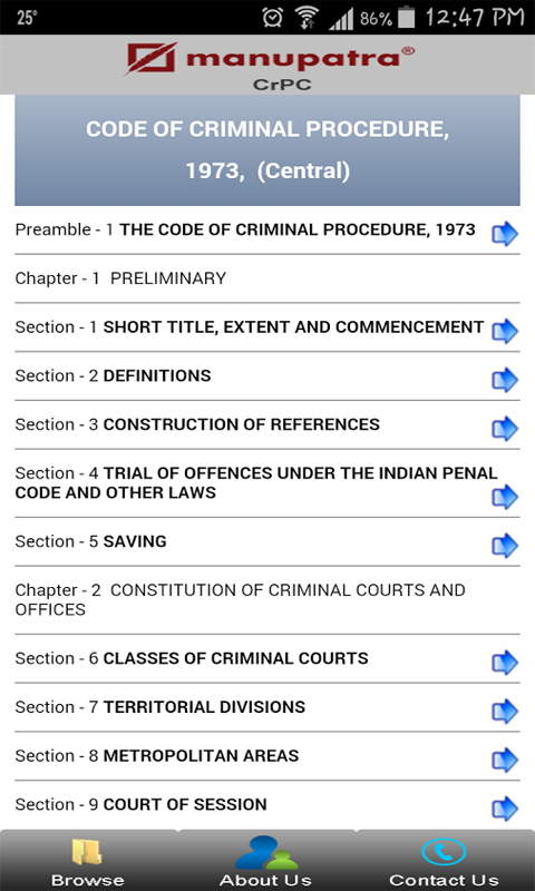 Complete Indian Code Of Criminal Procedure is available section wise which is quickly browsable. Just scroll through sections on your smart phone.