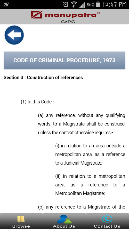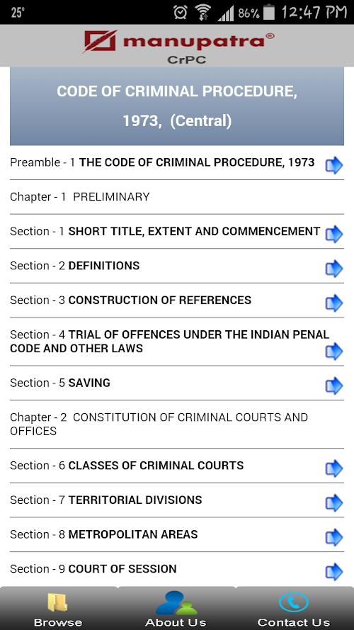 Complete Indian Code Of Criminal Procedure is available section wise which is quickly browsable. Just scroll through sections on your smart phone.