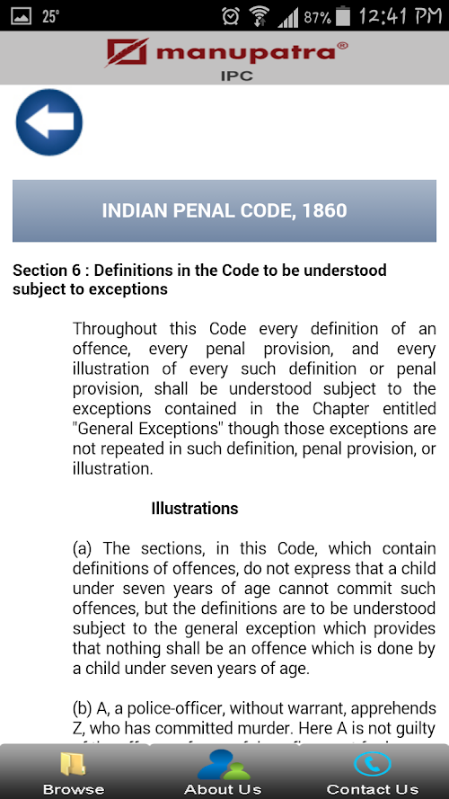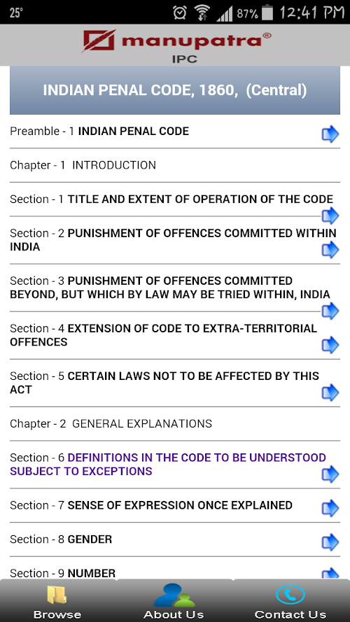 Complete Indian Penal Code is available section wise which is quickly browsable. Just scroll through sections on your smart phone.