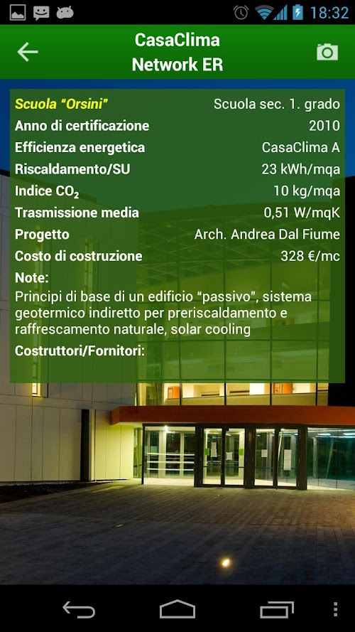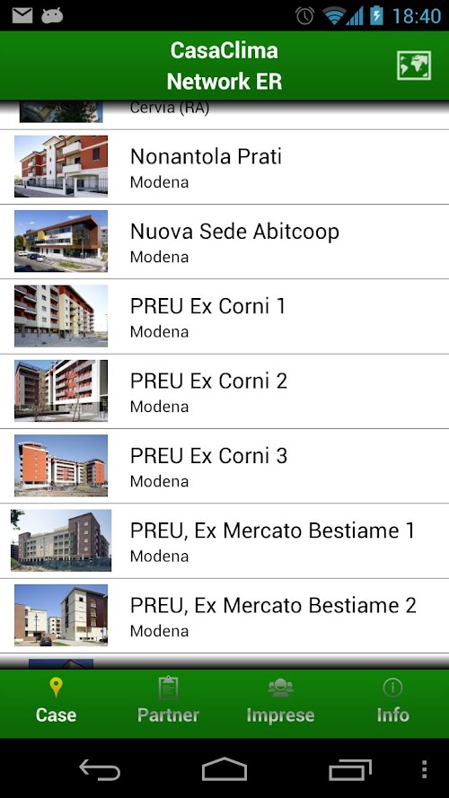 Mirar LTD and CasaClima Network Emilia-Romagna disclaim any liability as to the completeness and correctness of the content of the data contained in the guide, as well as on the content of web pages linked by the application. The location of the buildings shown on the map is indicative and do not necessarily reflect the true position in the region.
