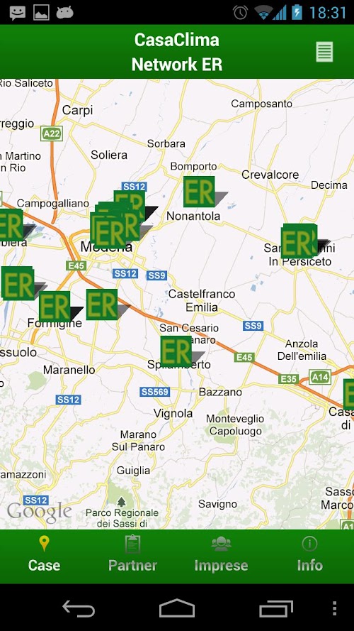 MirAR s.r.l. e CasaClima Network Emilia-Romagna declinano ogni responsabilità riguardo la completezza del contenuto e la correttezza dei dati riportati nella guida, nonché sul contenuto delle pagine web, linkati dall'applicazione. La posizione degli edifici indicata nella mappa è indicativa e non riflette necessariamente la vera collocazione nel territorio.Efficient and Sustainable Buildings - Map of CasaClima certified buildings in Emilia-Romagna.