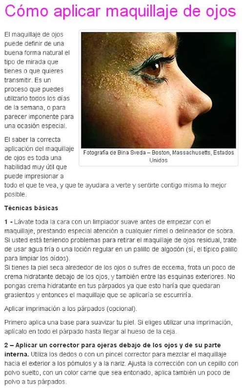 Preguntas tan simples como por ejemplo ¿Cómo se aplica el maquillaje de ojos? Ya tienen una respuesta con esta app. Por ejemplo se debe preparar los ojos, se utiliza un delineador, aplicación de sombras, etc. Esta app te enseña el camino para conseguir un buen maquillaje de ojos y además paso a paso.
