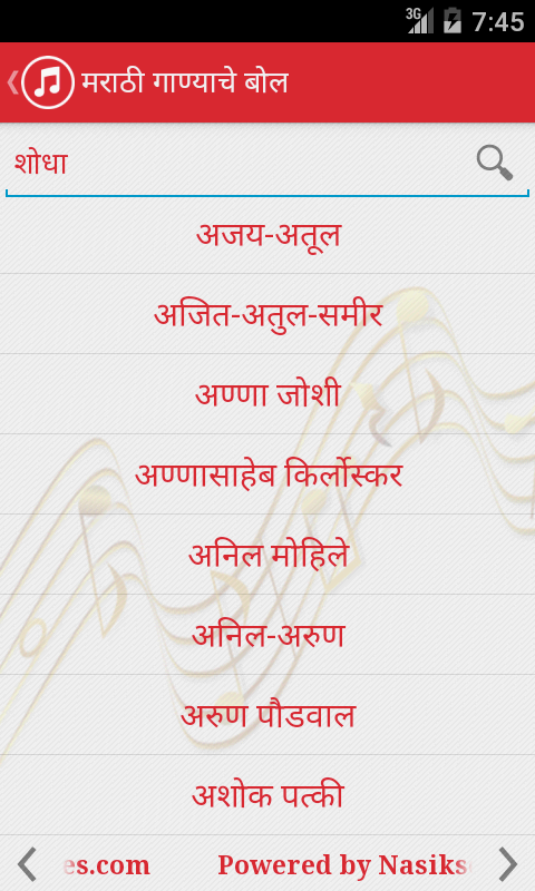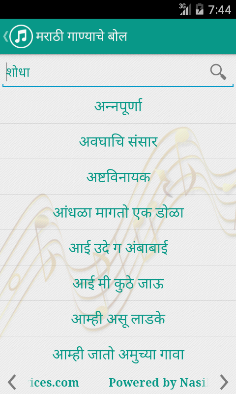 MARATHI LYRICS offers you free, unlimited access to all your favorite marathi songs lyrics on your mobile phone, no matter where you are. With our collection of New Songs to Old Songs, you can enjoy millions of Marathi songs lyrics. If you're still looking for more options, try our discover section and listen to different playlists; index, Git, gangit, movie or play.