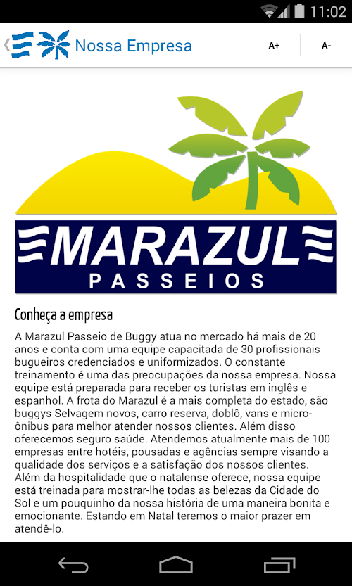 Então, o que está esperando?? Baixe agora grátis em seu Android o aplicativo Marazul Turismo e conheça Natal de uma forma diferente. Thinking of our customers, we brought Marazul Tourism application, being more a differential of our company. With it our customers can: