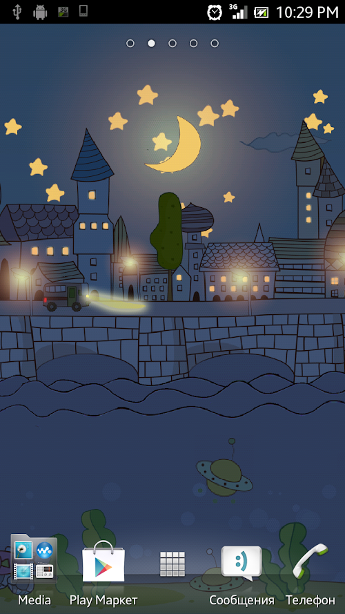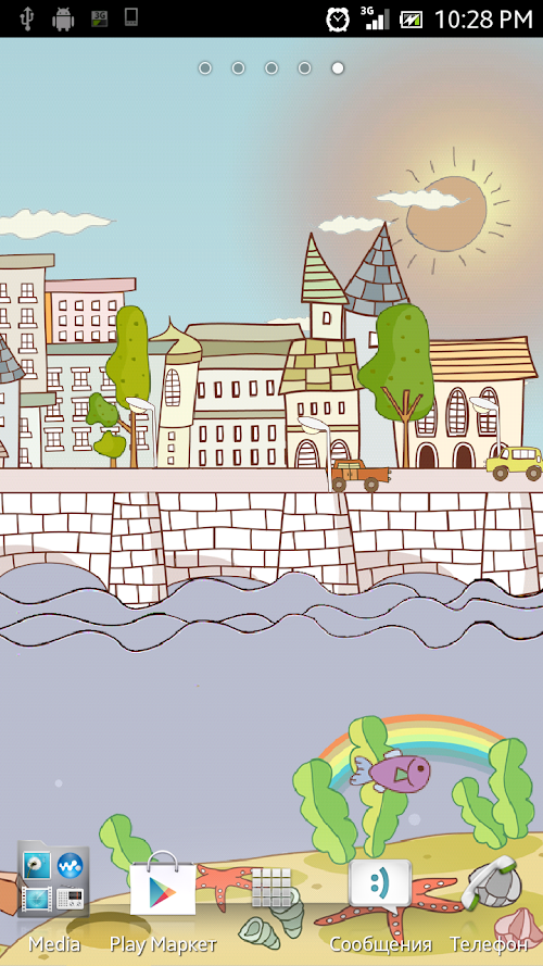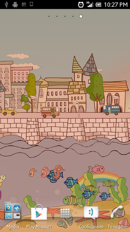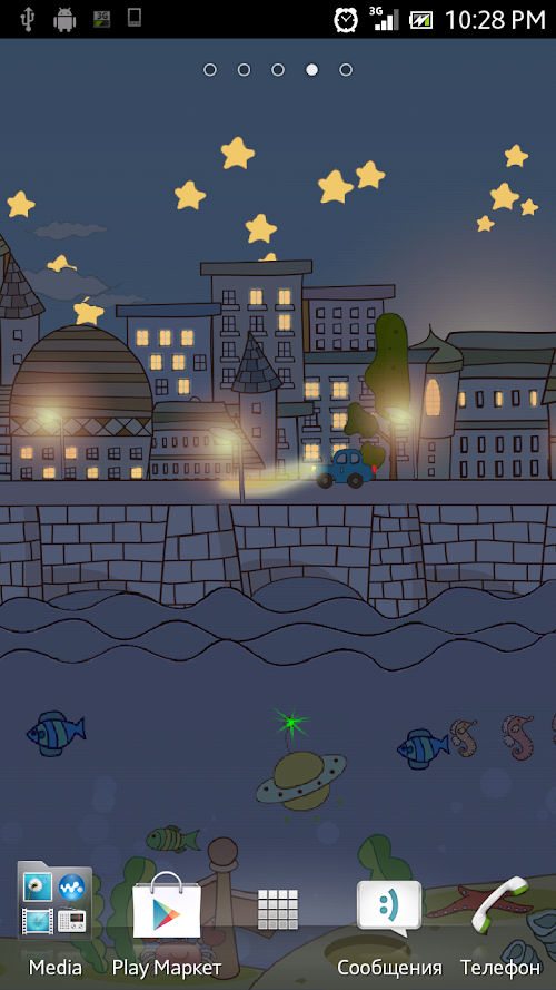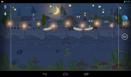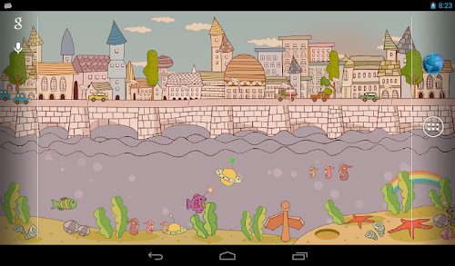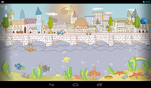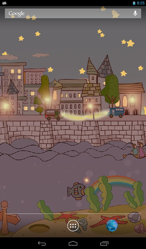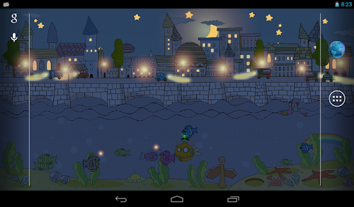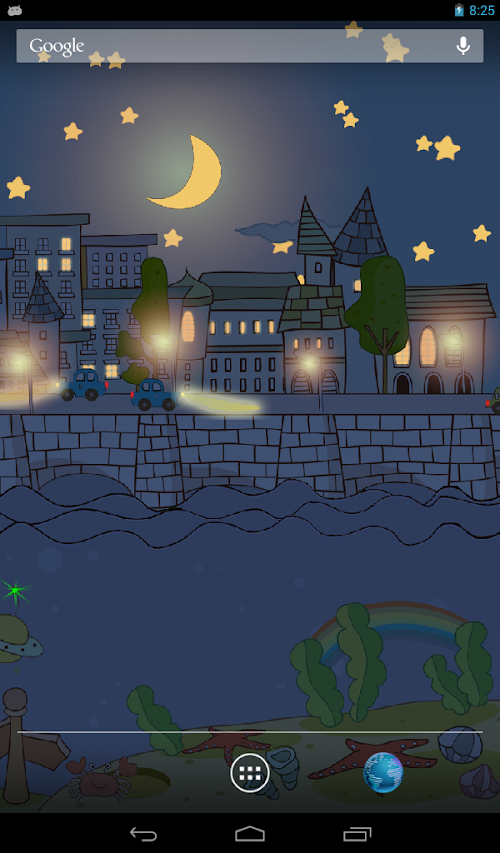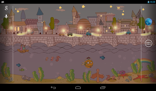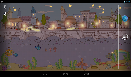 Your positive mood is guaranteed with our Maritime City Wallpaper! You will discover graphical colourful seaside city with a beautiful houses, vibrant sea, blinking street and window lights, cars, bright sky, stars, submarines, multicolour fishes, seahorses, a crab, sea devil and others sea habitants. You will meat some extraterrestrials on the seabed. The wallpaper looks like graphical picture filled with bright joyful colours. It will bring you a plenty of positive emotions! Realistic street agleam lights and sky change during the day and night. Amazing star sky at night.