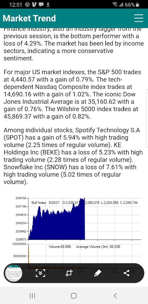 Stock market trend analysis using intraday market data from individual stocks and ADRs traded on US market. Market sentiment analysis relative performance of sector and industry groups.