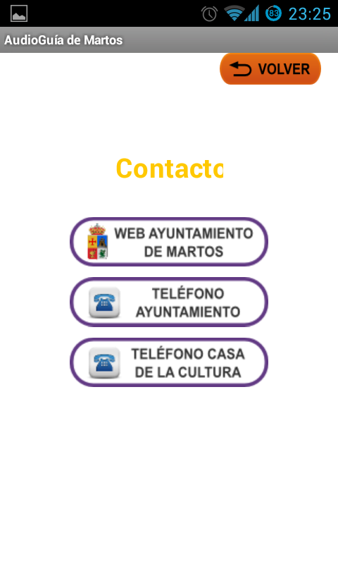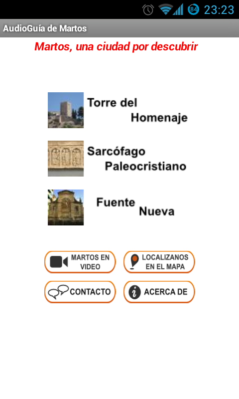 IMPORTANTE: Durante la instalación en los requisitos se indica que la aplicación puede tener algún tipo de coste al poder realizar llamadas. Esto se debe a que se han incluido dos botones para llamar directamente al Ayuntamiento y a la Casa de la Cultura de la localidad pero los números de teléfono preprogramados no son los oficiales y, están pensados para que el móvil no pueda marcarlos con lo cual no se produce coste alguno.Martos AudioGuide is an application in which are three of the many monuments from the city.