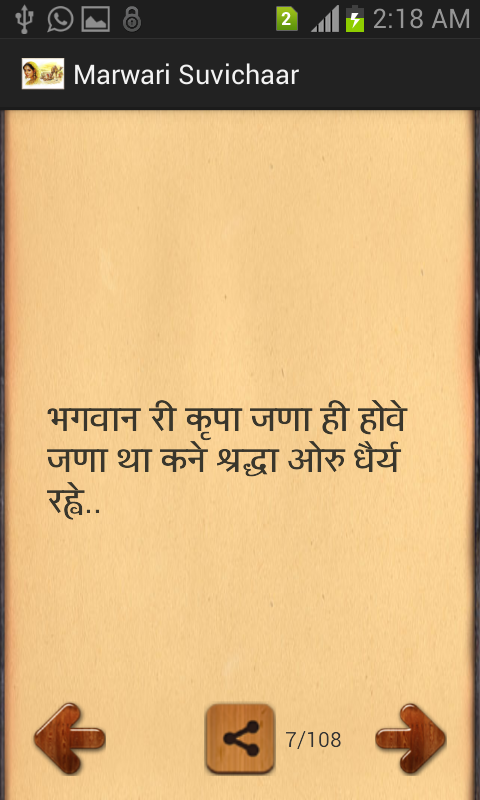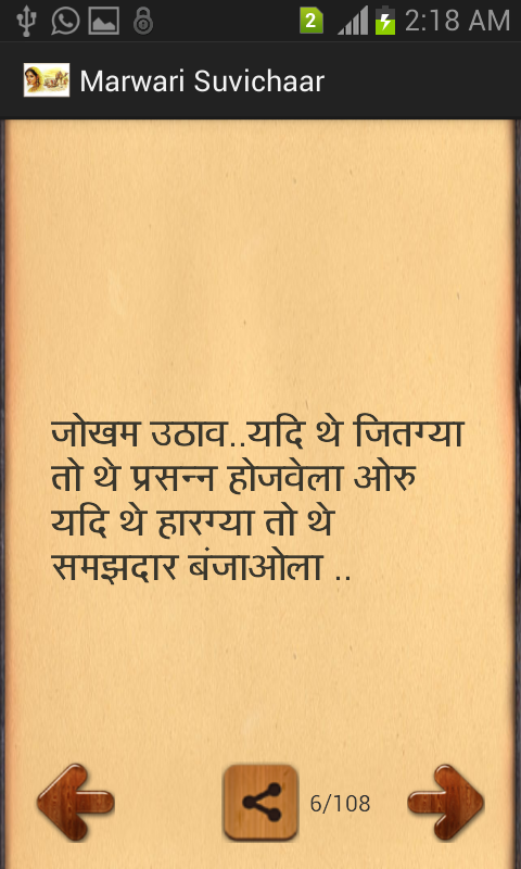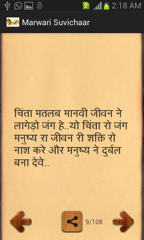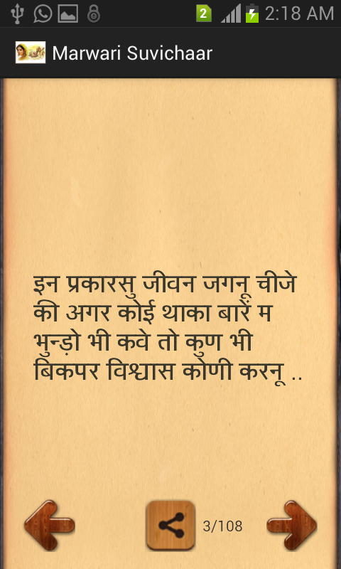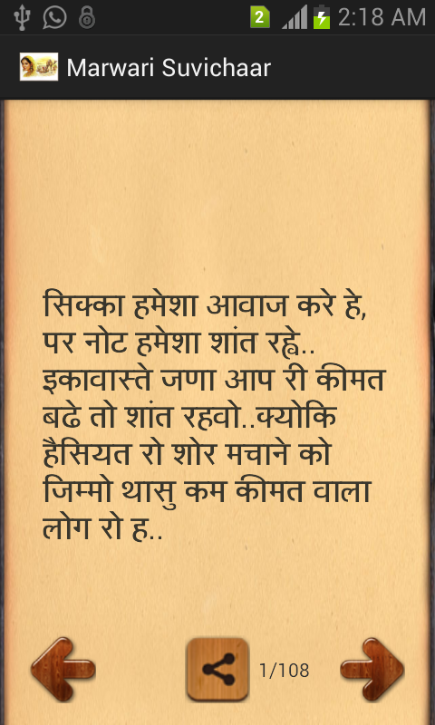 This is an exclusive app which contains Suvichar (thoughts) in original Marwari language itself...Marwari language has not the official status..but it is still used in Rajasthan ..but as per my knowledge, the languages in which there are no written literatures, comes to extinction..So, in order to transfer this sweet and polite language to the new generation, i made this app..Every language has its status in technical world..but marwari language has not..So by this app, i am trying to introduce the marwari language to the technical world and the new technical generation..i am also not perfect in marwari...so if you have knowledge about some particular words or phrases in marwari, please suggest and comment..your suggestion are valuable..if you like this app, then please share it..you can share this via facebook, whats app, twitter, etc..thank you..GHANI KHAMMA..