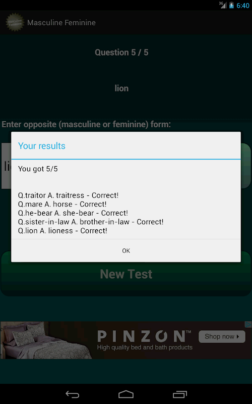 The application comes with over 140+ words where you can test out / practice your knowledge of English Gender.