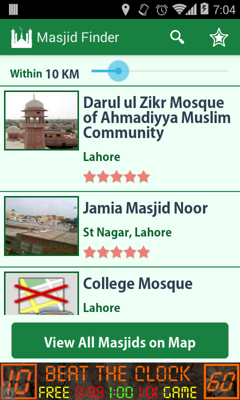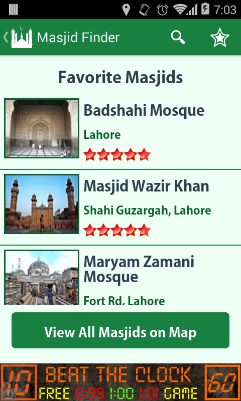 Masjid finder provides you the listing of masjids around you. Masjid finder also shows all details about that masjids. You can see all info of a masjid e.g. address, map, website and photos.