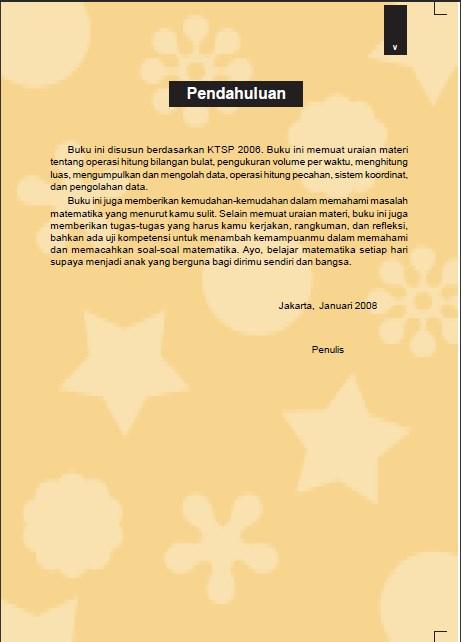 Dalam buku ini kami mencoba menyajikan materi yang sesuai dengan urutan pada materi pelajaran Matematika dalam Standar Isi 2006. Buku ini kami lengkapi pula dengan berbagai latihan untuk menguji kompetensi siswa dengan harapan dapat lebih membantu siswa untuk belajar secara mandiri di bawah asuhan guru.