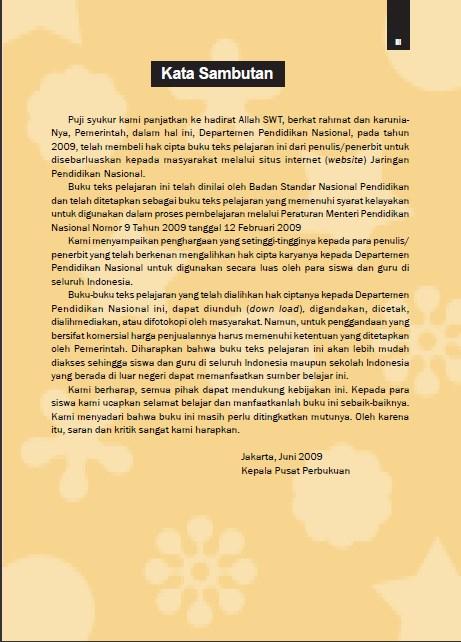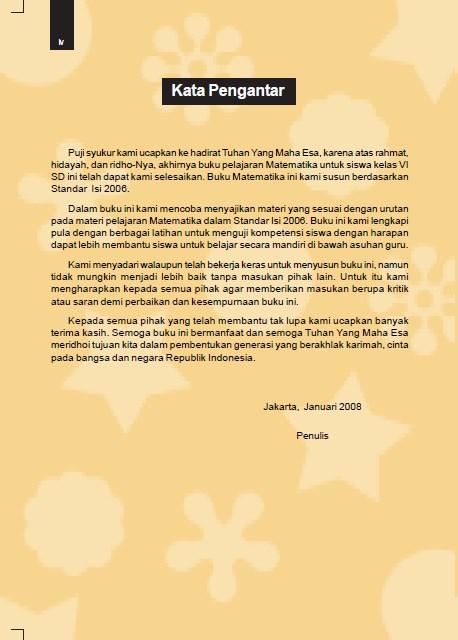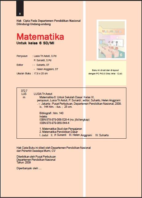 Kepada semua pihak yang telah membantu tak lupa kami ucapkan banyak terima kasih. Semoga buku ini bermanfaat dan semoga Tuhan Yang Maha Esa meridhoi tujuan kita dalam pembentukan generasi yang berakhlak karimah, cinta pada bangsa dan negara Republik Indonesia.Thank God we give to God the Almighty, because upon grace, guidance, and his blessing, finally math textbooks for sixth grade students have been able we finish. This book is structured Mathematics Content Standards in 2006.