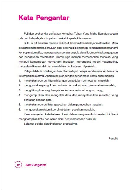Buku ini ditulis untuk memenuhi kebutuhanmu dalam belajar matematika. Mata pelajaran matematika bertujuan agar peserta didik memiliki kemampuan memahami konsep matematika, menggunakan penalaran pola dan sifat, menjelaskan gagasan dan pertanyaan matematika. Kamu juga mampu memecahkan masalah yang meliputi kemampuan memahami masalah, merancang model matematika, menyelesaikan model dan menafsirkan solusi yang diperoleh.