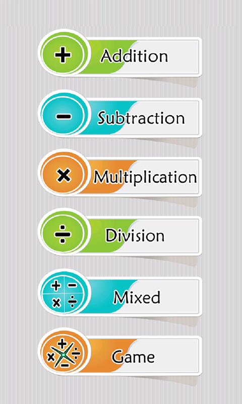 Improve your math ability as you enjoy various levels in each category. Each category has easy,medium and hard levels.