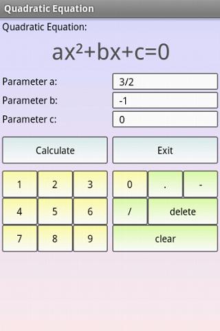 Quadratic Equation Solver: You are able to solve quadratic equations. The program is able to find both real and complex roots. Just enter the parameters of the equation.
